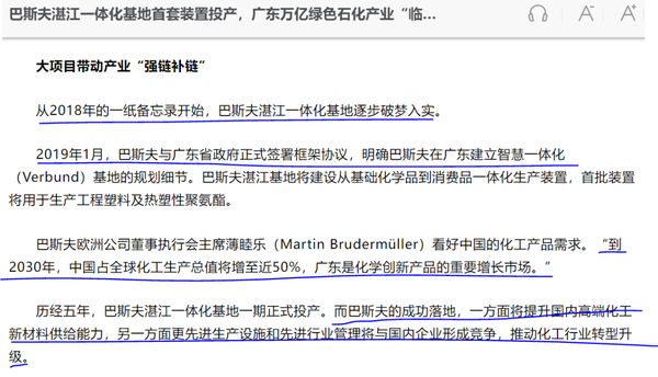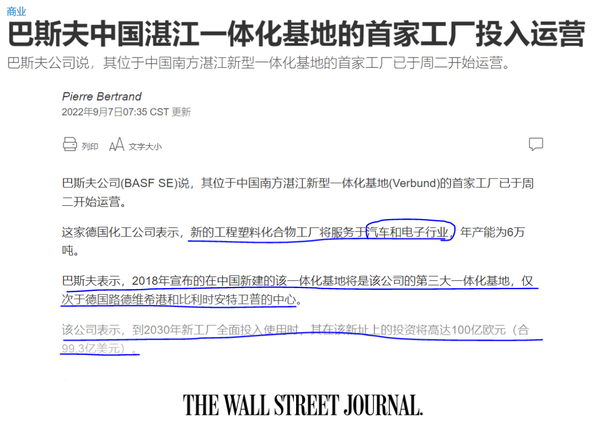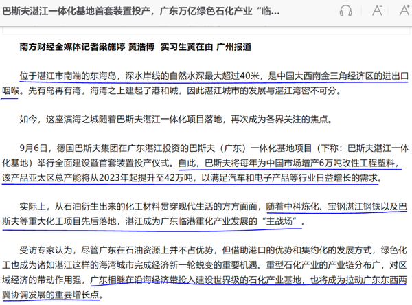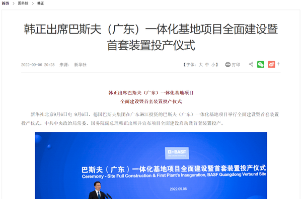 新闻背景:9月6日,德国巴斯夫集团在广东湛江投资的巴斯夫(广东)一z | O Z x体化基地项目举行全面建设暨首套装置投产仪式;巴斯夫(广东)一体化基地项目总投资约100亿欧元,是德国企业在华投资规模最大的单体项目。