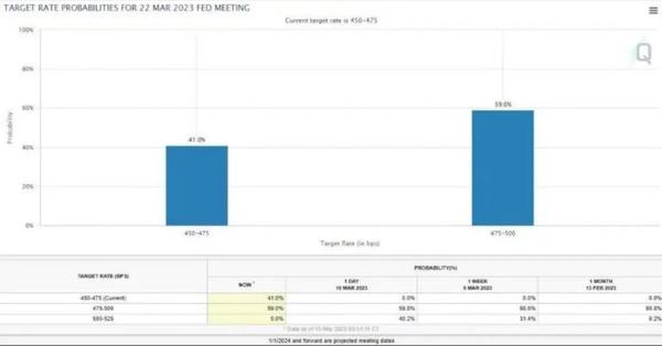 芝加哥商交所的FedWatch工具显示,3月美联储不加息概率为41%,一天前该数值尚为0。