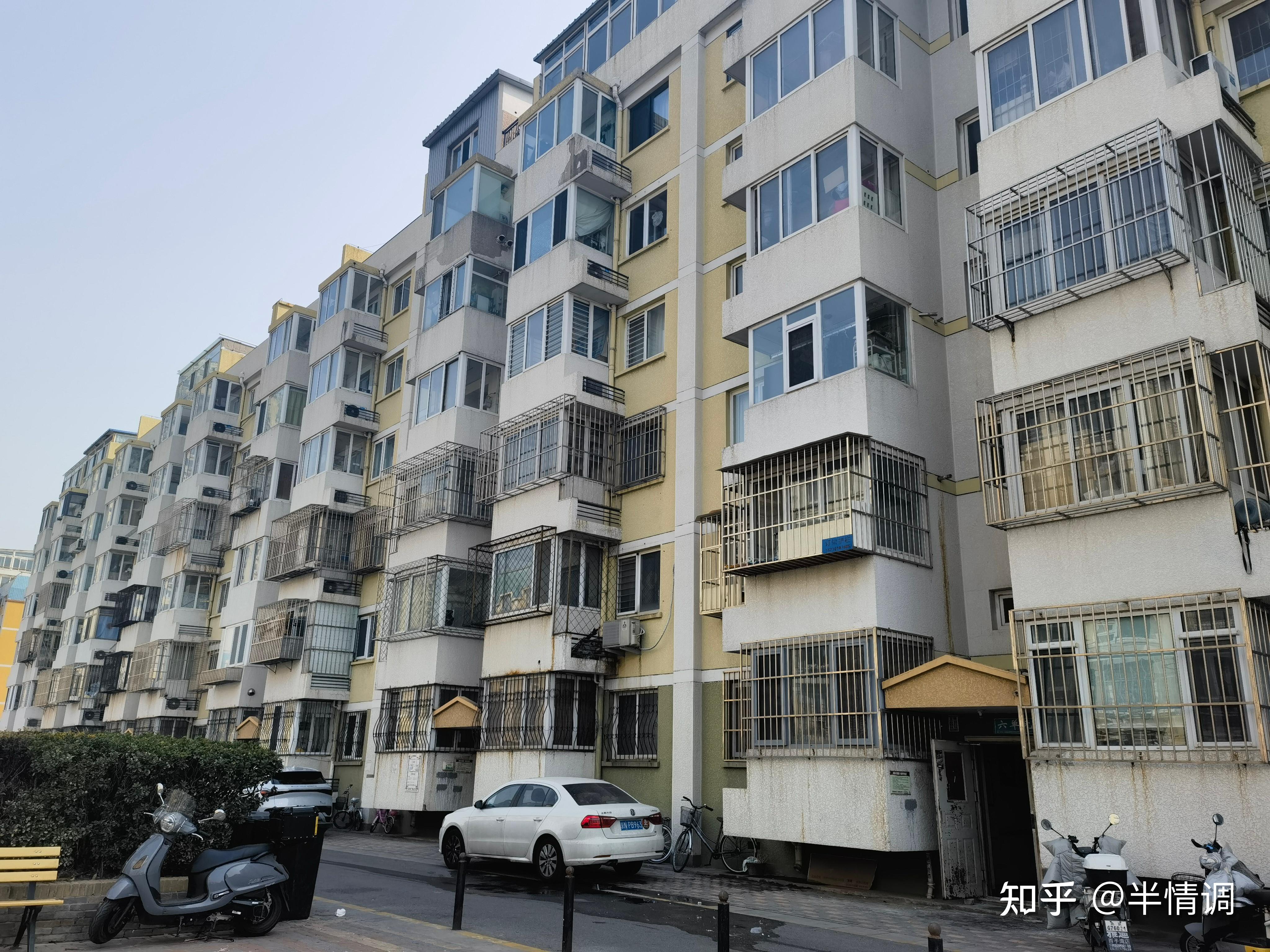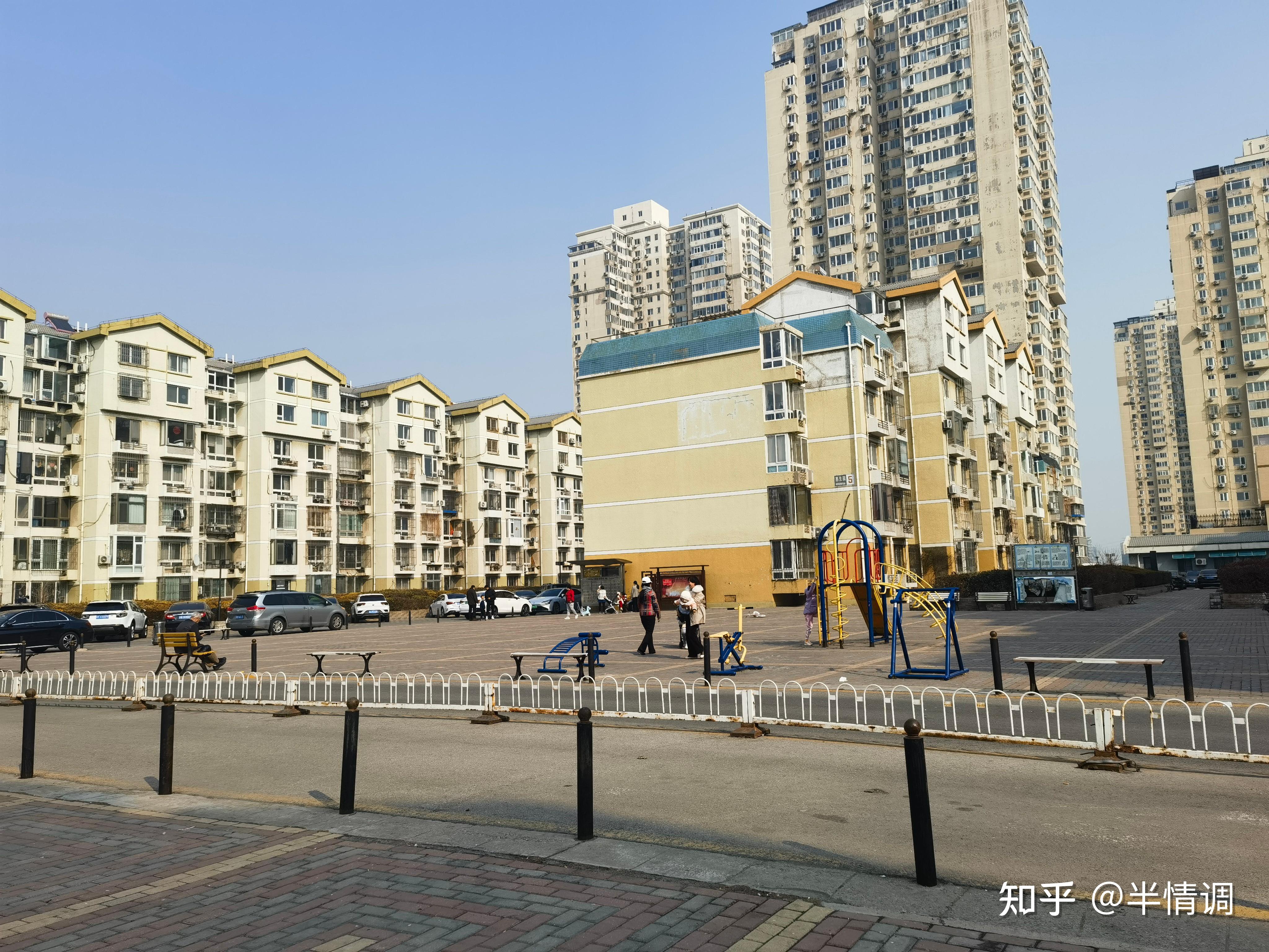 小区不是纯商品房,还有公房,总高18-22层的高塔楼,红色外立面,有一个小的活动场所,地面上车特别多,自行车和电动车也多,小区挺显老的,有黑电线穿过。