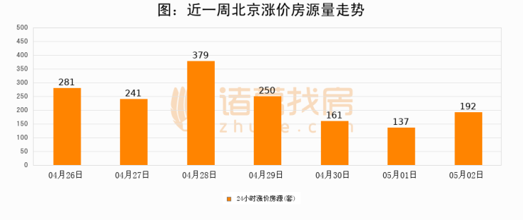 根据诸葛找房数据显示,北京24小时涨价房源量为192套,* Q s g % |较05月01日增加55套,环比上涨40.1%。与此同时,涨价房源占比小幅扩大,业O % k Y I主信心有所提升。