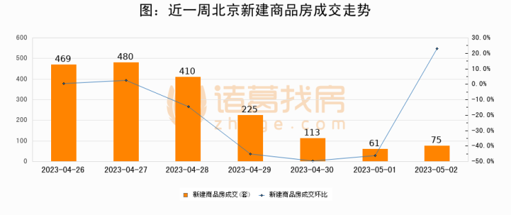 根据北京市住房和城乡建设委员会数据显示,2023年05月02日北京新建商品房成交75套,较昨日增加14套,环比上涨22.9%。近一周北京新建商品房日均成交262套。05月02日单日成交75套,低于近一周平均水` N ^ 4 H平71.4%。