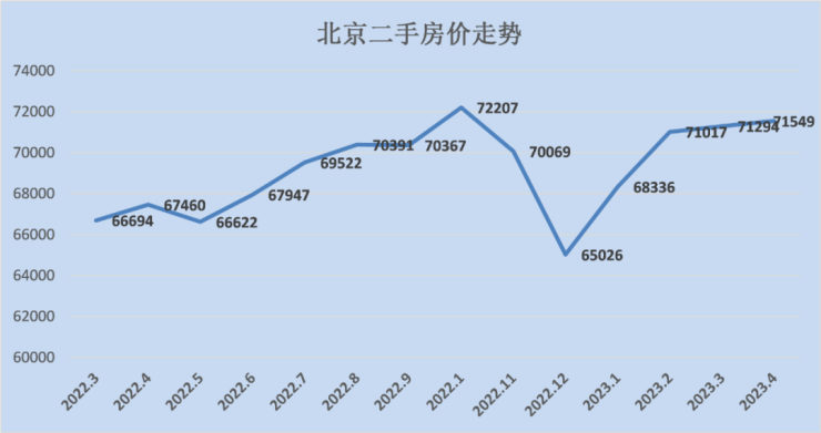 北京二手房4月均价为71549元/㎡,同比上涨6.06%,环比上涨0.36%。