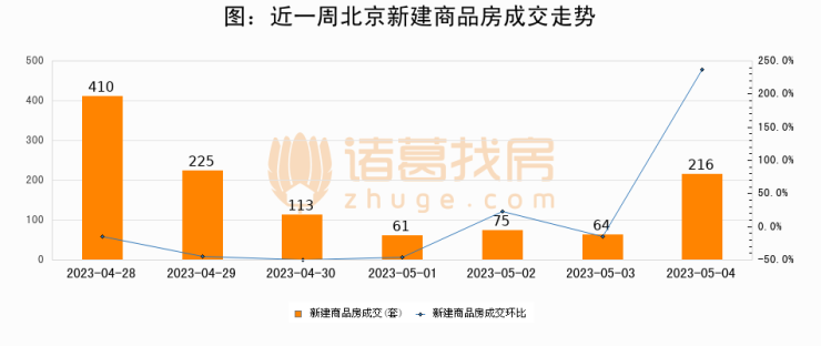 根据北京市住房和城乡建设委员会数据显示,2023年05月04日北京新建商品房成交216套,较昨日增加152套,环比上涨237.5%。近一周北京新建商品房日均成交167套。05月04日单日成交21r i k % F r A 2 `6套,高于近一周平均水平29.3%。Y E K . } z a 1