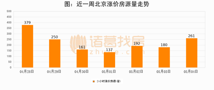 根据诸葛$ k e , G K g Q找房数据显示,北京24小时涨价房源量为261套,较05月03日增加81套,环比上涨45%。与此同时,涨价房源占比小m @ 1 \ U幅扩大,业主信心有所提升。