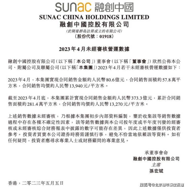 根据公告,2023年4月融创中国集团实现合同销售金额约人民币80.6亿,合同销售面积约57.8万平米,合同销售均价约人民币13940元/平。