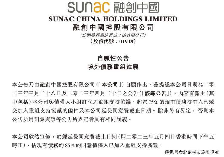 5月4日发布的公告表示,85%债权人已加入重组支持协议。公告标明,同意费须于重组生效日期X y P H X 5 J或之前支付,前提是同意债权人持有或已获得符合重组支持协议相关规定的合格受限债务;在计划会议上(无论亲身或委派代表)就其于记录日期持有的现有债务的总额投票赞成计划;并未行使其终止重组支持协议的权利,且并未在任何重大方面违反重组支持协议的任何相关条款及条件。