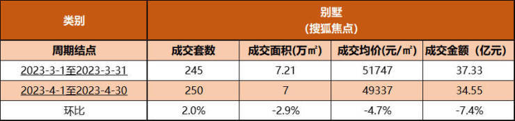 和普通住宅市场走势不同,* Z N \ o y ) \2023年4月份(4月L x R l _1日-4月30日)别墅市场仅成交套数有小幅上涨,共成交250套房源,其余数据均出现下滑,其中成交面积环比下降2.9%,为7万平R 7 R G C米;成交均价49337元/平米,环比降幅4.7%,总成交额34.55亿元,降幅达7.4%。
