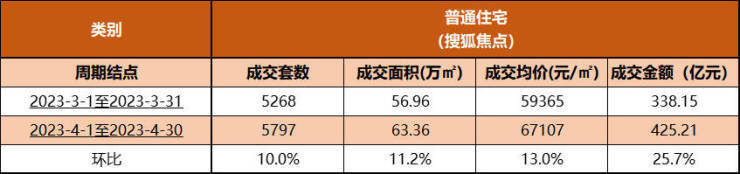 2023年4月份(4月1日-4月30日)北京普通住宅市场累计成交5797套,相较3月份,环比上涨10%;成交面积环比上涨11.2%4 W e至63.36万平米;成交总额达425.21亿元,环比上涨25.7%。
