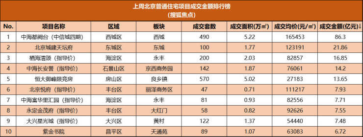 再成交_ w W ? , m 1 7 C金额方面,西城区的中海都阙台以86.3亿元,稳居销冠宝座,东城区的北京城建天坛府M Y 4成交金额为21.86亿,位列第二,第三名则属于栖海澐颂,成交金额为16.85亿。
