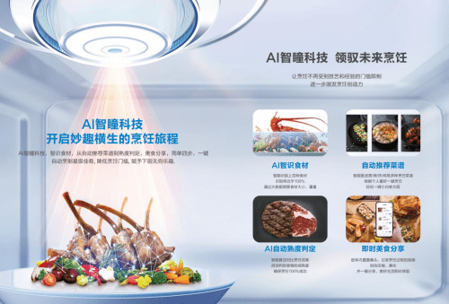 其中,AI智瞳科技搭配数字厨电生态,能为用户带来AI智识食材、自动推荐菜谱、AI自动熟度判定、即时美食分享等数字H a + 8 E K P E化烹饪极致体验。
