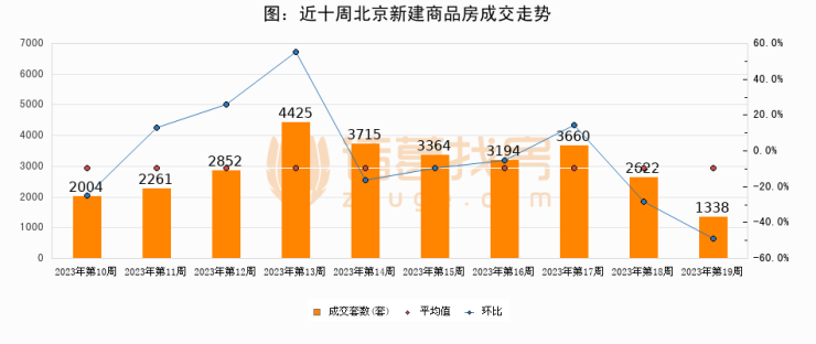 进入2023年第19周(05月01日-05月07日),北京新建商品房成交1338套,较上周减t 4 \ l Z少1284套,环比下降49%。从近十周成交来看,周均成交套数为2943套,本周成交1338套,低于近十周平均成交量54.5%。
