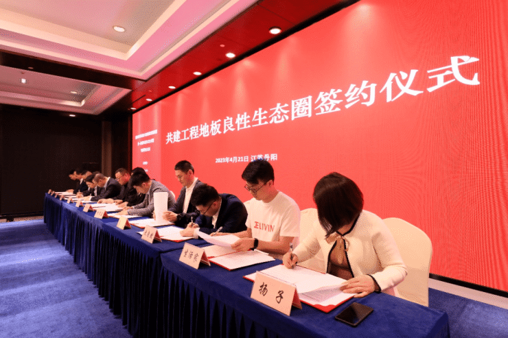 2023年4月21日,共建工程地板良性生态圈签约仪式在江苏丹阳举行,安徽扬子地板股份有限公司、巴洛克木业(中山)有限公司、大自然家居(中国)有限公司、德尔未来科技控股集团股份有限公司、江苏贝尔装饰材料有限公司、江苏肯帝亚木业有限公司、上海菲林格尔木业股份有限公司、深圳中宏新材料科技有限公司、圣象集团有限公司、书香门地集团股份有限公司、浙江世友木业有Z u A $ ] 7 S l限公司、珠海采筑电子商务有限公司等12家地板供应链企业联合发起共建– M 0 . y X , r n工程地板良性生态圈,并作为首批共建单位签署了《共建工程地板良性生态圈公约》。