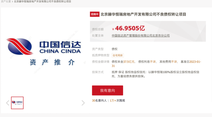 日前,京东法拍上架了一则来自中国信达的资产推介消息,中国信达资产管理股份有限公司北京市分公司(下称信n 6 e达北分)作为处置主体,转让北京赫e 2 #华恒瑞房地产开发有限公司(下称主债务人)46.9505亿元的不良债权,其中债权本金达37.5亿元,利息和其他费用暂不详。_ V j u d