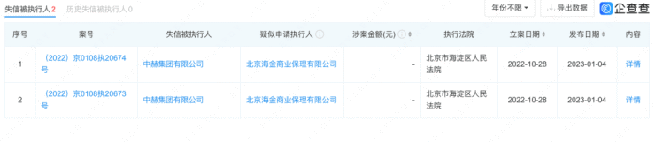2023年1月4日,因有履行能力而拒不履行生效法: \ ^ Y [ : s律文/ ) c书确定义务,北京国安足球俱乐部有限责任公司、中赫集团有限公司、中赫置地有限公司、& Z c V g Q 0 9 N中赫置地投资控股有限公司等新增2则失信被执行人(老赖)信息,执行法院为北京市海淀区人民法院。两案件均于Z g 0 $ q M t D n去年10月被强制执行,执行标的共计5亿元。