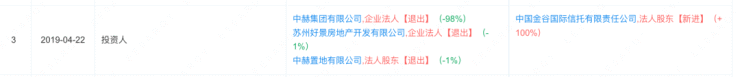 股东信息显示,北京赫华恒瑞曾由中赫集7 5 @团有限公司控股,2019年4月,原股东中赫集团有限公司及旗下中赫置地有限公司、苏州好景房地产开发有限公司均退出股东,中国金谷国际信托有限责任公司(以下简称“金谷信托”)全资入股。金谷信托成立于19v S h P I z s m Y93年,目前注册资本22亿元,由中国信达资产管理有限公司持股93.75%,中国妇女活动中心持股6.25%。