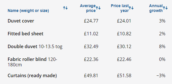 家具面料、窗帘和床上用品,双人羽绒被的价格上涨了8%,至32.49英镑;而窗帘的价格下跌了3%,至49.81英镑。就综合数据而言,这个@ L ~价格篮子的3 = ( * l / I总额为140.45英镑B } 0 c .,意味着1%q O % + A U :或1.46英镑的小幅上涨。