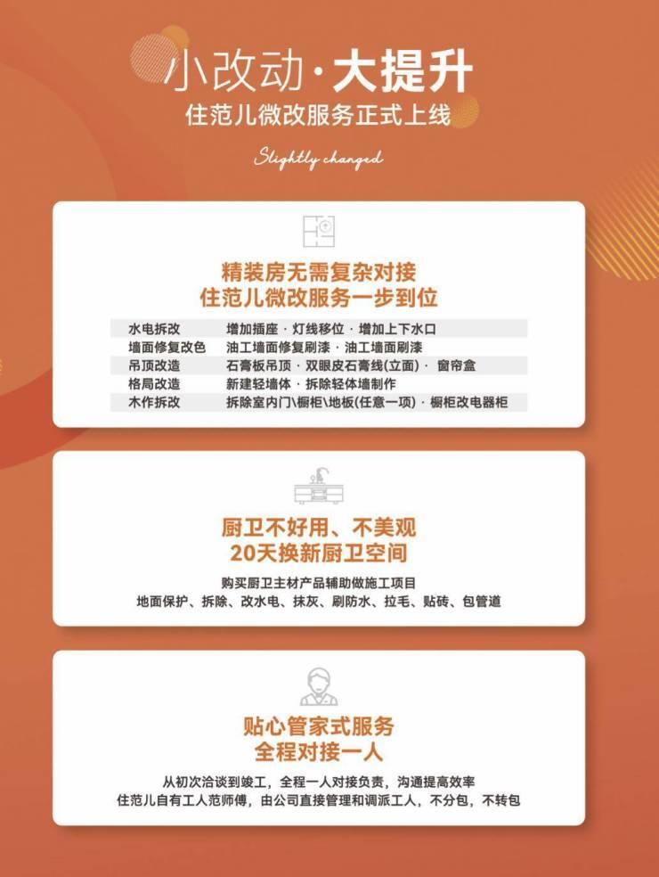 从长远看,精装房无疑是房地产行业的大势所趋,未来市场潜力巨大。针对北京精装房交付后到入住前存在“} D * u U @ { 2交付品质参差不齐、装修缺乏个性化、整屋家具软装家电配置”等等难题,住范儿为消费者提供“精装改造一站式”的整体解决方案,真正提升居住体验,节约资源、降低二次装修成本,助力业主共同实现美好新生活。
