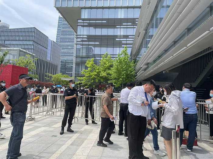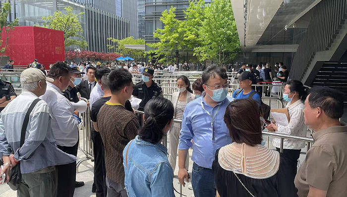 5月16日上午,云锦东方进入认筹的最后一天,据界面新闻观察,现场仍聚集上百人在烈日下,有人在排队进场认筹,I F U &有人在整理资料。因为此次认筹只能进入一人,也有不少家属在向保安争取进入现场,“显然w $ B { E n不放心2 j Y / W e \另一h M ` q A ! ~ [半。”