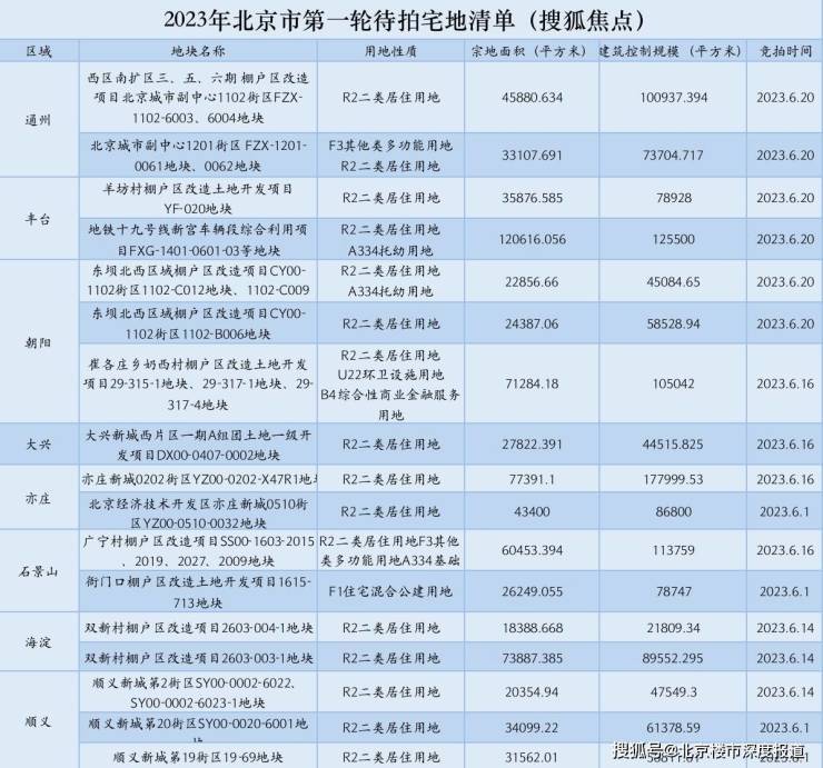 搜狐焦点讯,2023年北京市第一轮供地计划的23宗地已经全部推出,其中6宗已成交,另有17宗地将分别在6月1日、14日、16日和20日4个日期节Y a o z R点分别进行竞拍。
