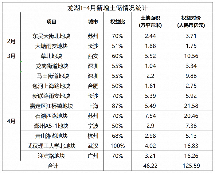 根据龙湖在港交所披露的月度经营数据统计,前4月共拿下13宗地块,土地面积合计超40万平方米,收购地块权益对价超125亿元。