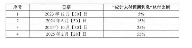 利息兑付方面,奥园集团将在2023年12月30日、2024年6月30日、2024年10月30日和2025年2月28日分别兑付“应计未付预期利息”比例的5%、15%、25%和55%。