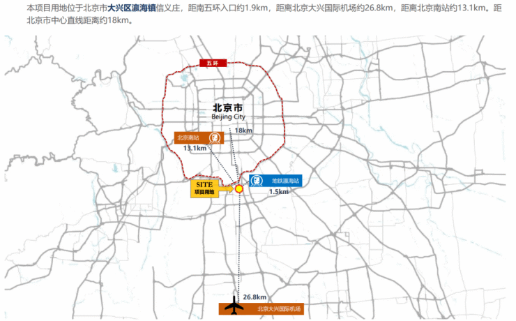 项目北侧距离南五环直线距离仅约1.4公里,东侧临近京台高速] # 2 a e,距离地铁8号线瀛海站直线约1.8公里。