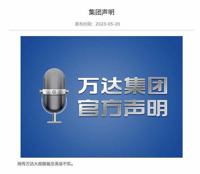5月20日早间,万达集团官网还发布声明称:网传万达大规模裁员消息不实。