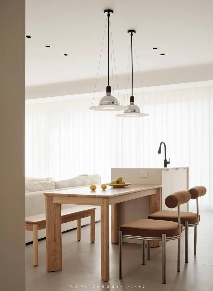 餐厅邻近玄关9 K l _ :,入户后映入眼帘的便是餐厅,客餐厅融合的布局使得整个用餐空间非常的明亮开阔。原木J d @的餐桌上方悬挂着两个精致的吊灯,配上柔软的布艺座椅,一天的疲惫瞬间治愈。