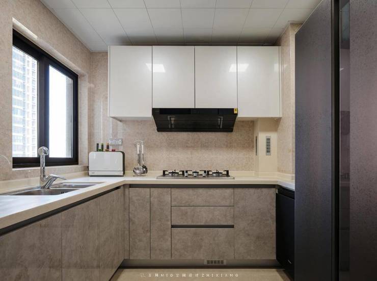 柜门更换成浅色,并重新规划了功能布局,右侧柜子拆除换成洗碗机,增强了厨房的使用体验,厨房的视觉效果也更加明亮宽敞。