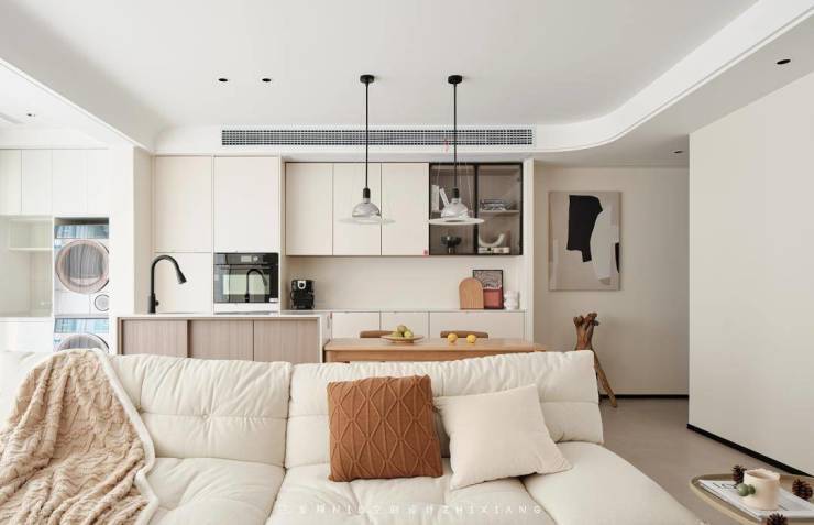 整排的柜子直通到阳台,根据区域划分了不同的功能,客厅区域用作餐边柜,不仅宽敞的操作台面,还有强大的储藏空间。阳台部分做了通顶的收纳柜,很好的将洗衣机烘干机包裹起来,让阳台U = / S X ! a e }看起来整洁明亮。