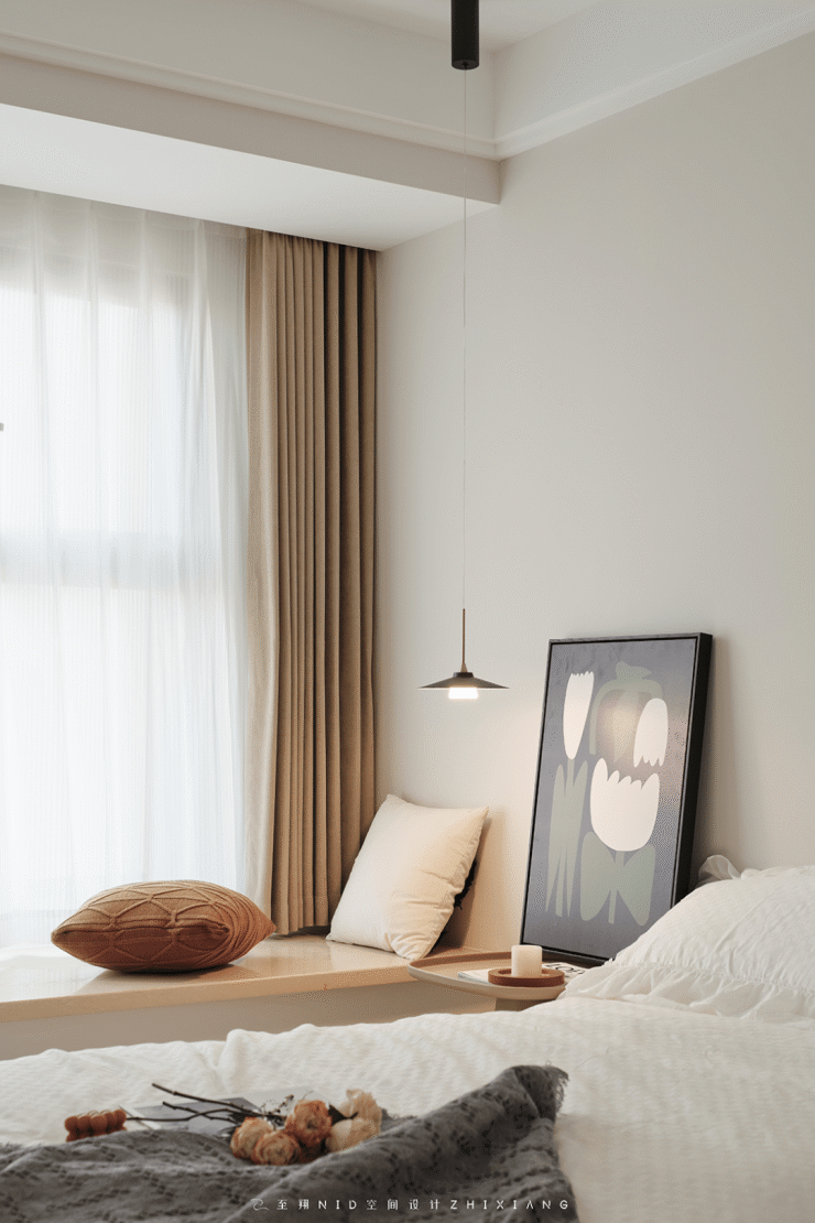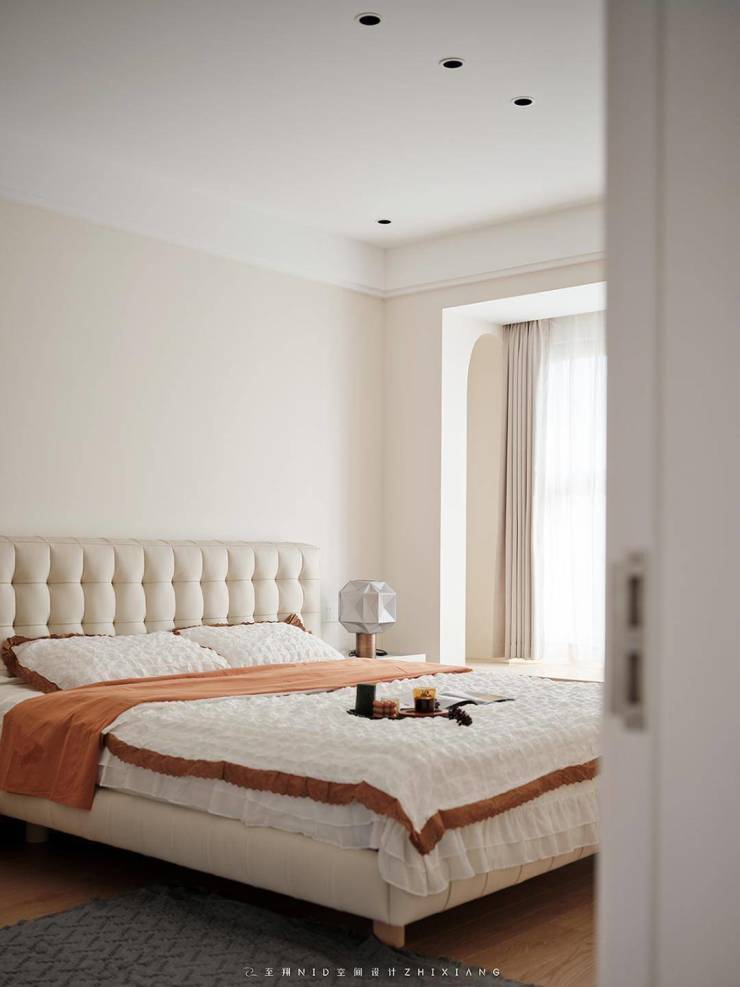 The master bedroom chooses warm milky white color, soft bag back bed, lean comfor3 ] J 7 E / – Atable and s7 8 t m +oft, milM I ? { v 3 Y ` Lk white nightstand simple decoration, making the whole sleeping environment elegant, waA a Wrm and romantic.