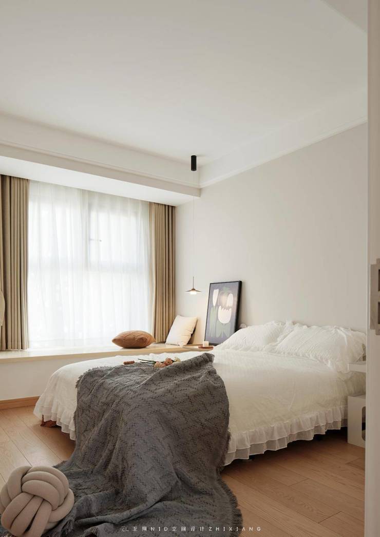 The secU b , wond bedroom chooses the wooden flG k S ] C X 4oor with the warm white wall, the whole space is bright and does not lose the temperature, providing a gentle and comfortable rest environment.