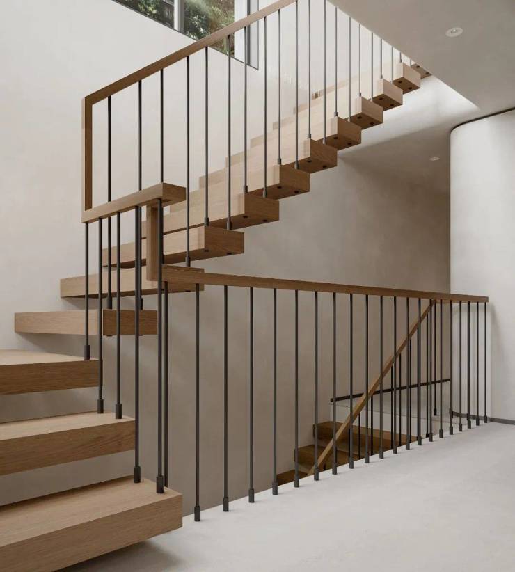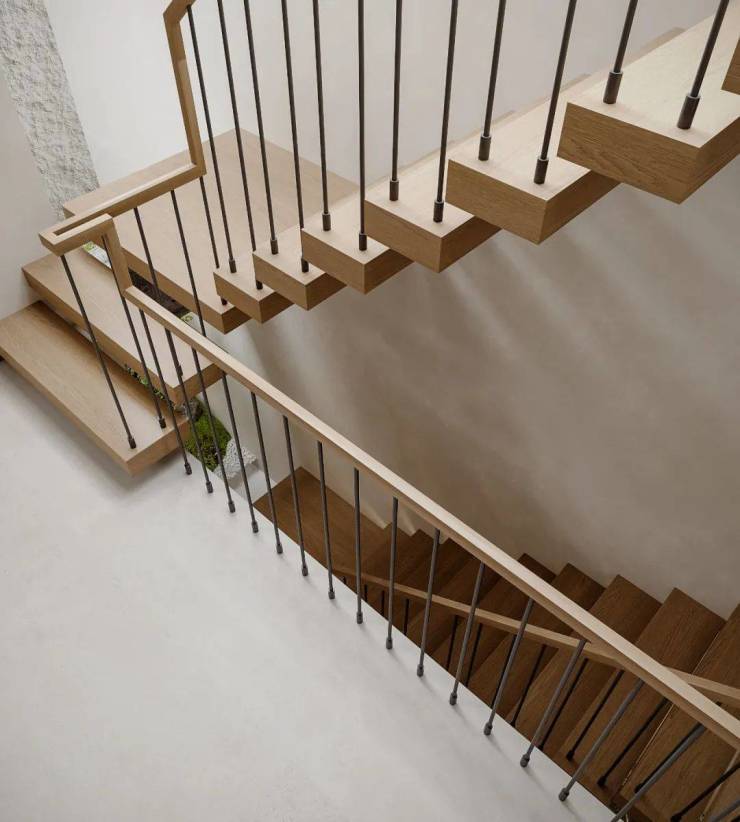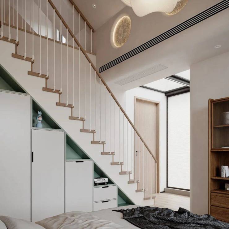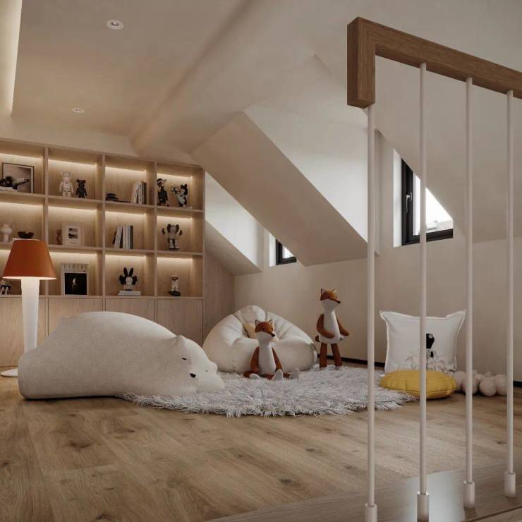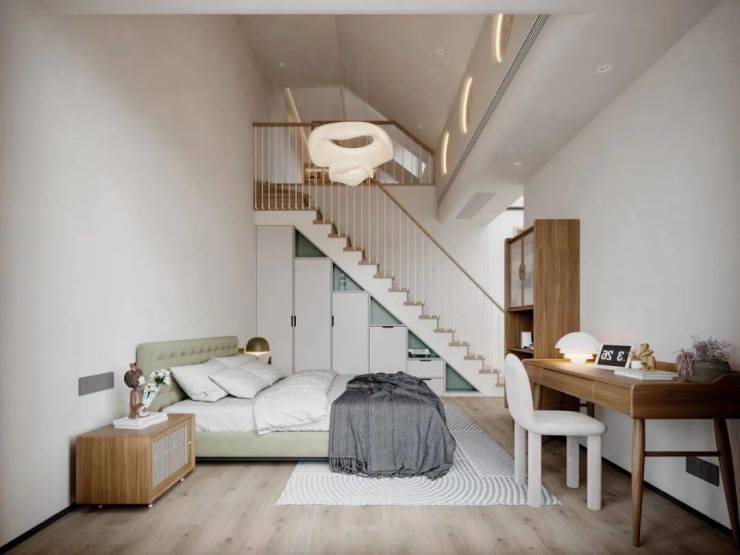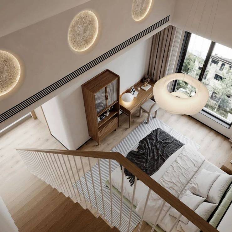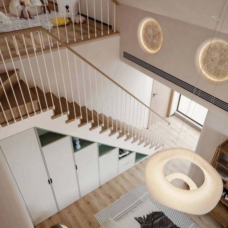 原木楼梯和原木围栏链接每个空间,巧用折角与光线流转,精致灵动,沉稳中带有律动,与白色墙面的搭配温馨和谐,不单调,营造出愉悦轻松的氛围。