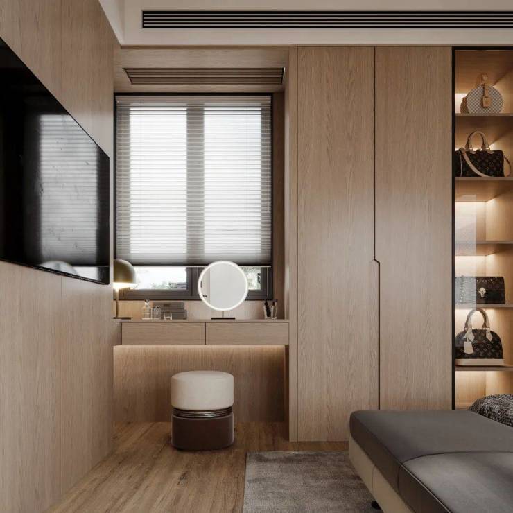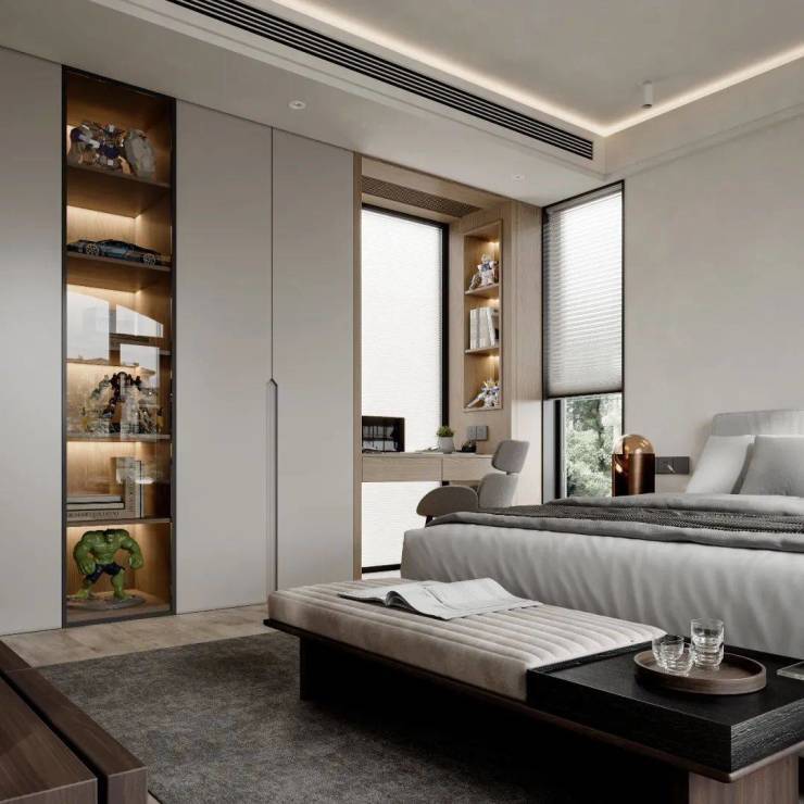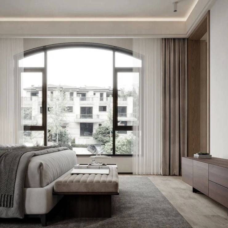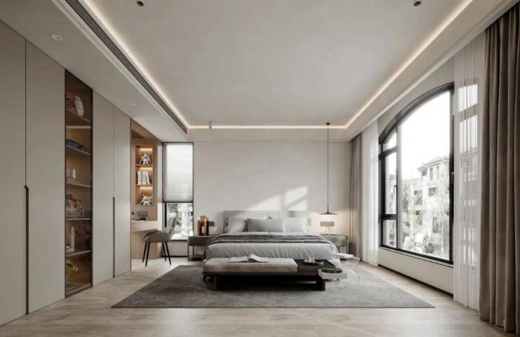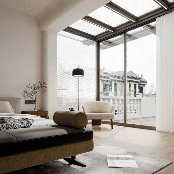 留白构造出朴实的简约之美,如清茶淡饭一般,_ ` 5 Q 6 T x v虽不及山珍海味那样丰盛,却不可或缺。卧室空间大量的留白和超大落地玻璃,使人有一种置身大自然,与天地万物8 F O Y / x P h融为一体/ } { E F – b _ Q的感= m s 1 q 6 r H觉。