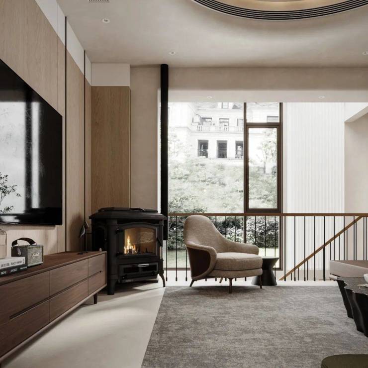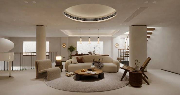 地下夹层是一个影音室,简雅的\ [ L c 9 – . ` M弧形曲面元素,弱化了块面带来的尖锐感,在张弛有度的节奏韵律中与人形成对话,成为主人内心之境的谦逊表达。