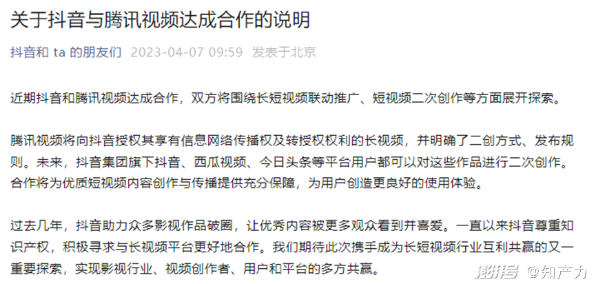 国内市场,腾讯视频与抖音的“长短之争”,从诉讼走向和解,为内容平台合作共赢提供了样板。
