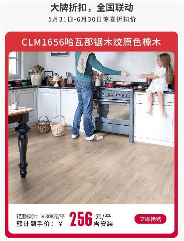 5月31日-– 4 | 7 a :6月30日,得高比利时Quick-Step艺术木地板CLM1656、SI| P M ) 9G4752、MJ3552爆款限时特惠,线上线下共享惊喜折扣价。价格降维,但品质升级!时尚的灰色系地板演绎百搭的品味家居,胜似实木的细节设计彰. ` 0 a P } J显自] r $ s e然美感,强悍防水防污性能诠释科技力量6 r u 6!宽板、长板、经典尺寸,3款爆品满足理想家居的多种想象。