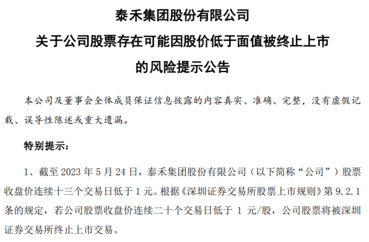 这已是泰禾第四次发布可能触发面值退市的终止上市风险提示公告。