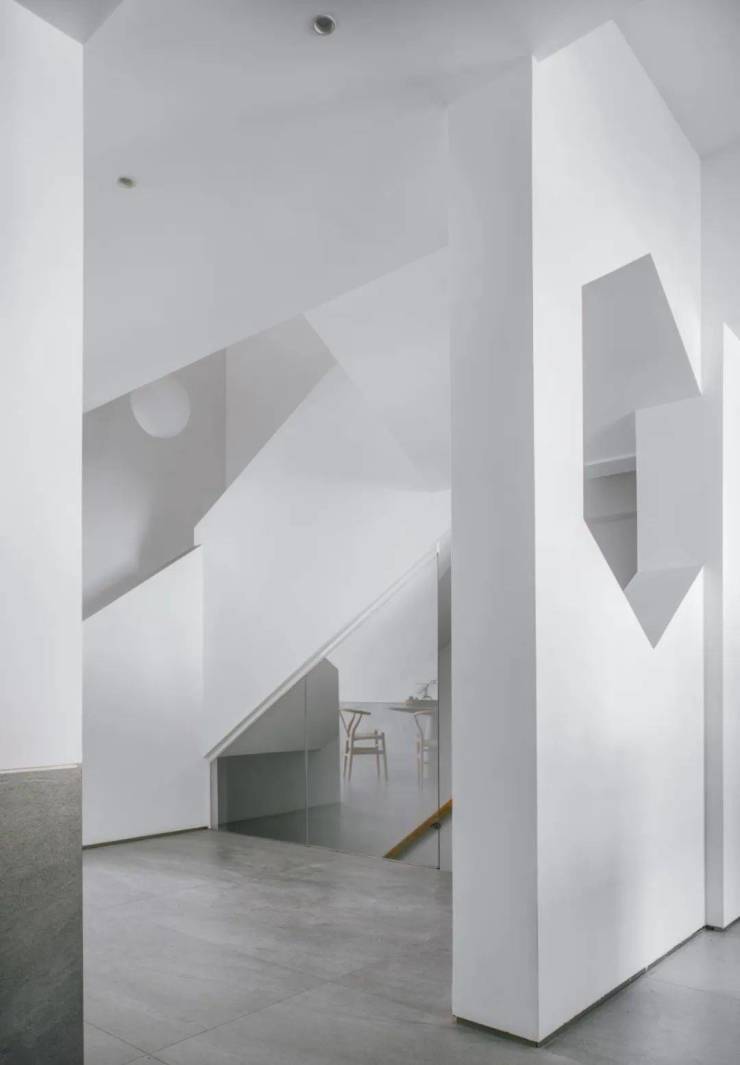这是一处联排住宅的室内设计,小区处于中国徽派建筑的氛围之中,假山凉亭小桥流水环绕四周,这启发我们采用简洁的徽派建筑元素,如坡屋顶,六角窗等,同时+ q ! X ) y r运用灰与白的色彩搭配,形成素雅的书卷气氛。