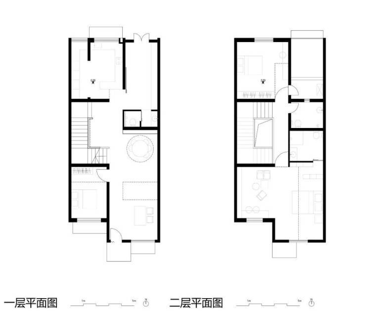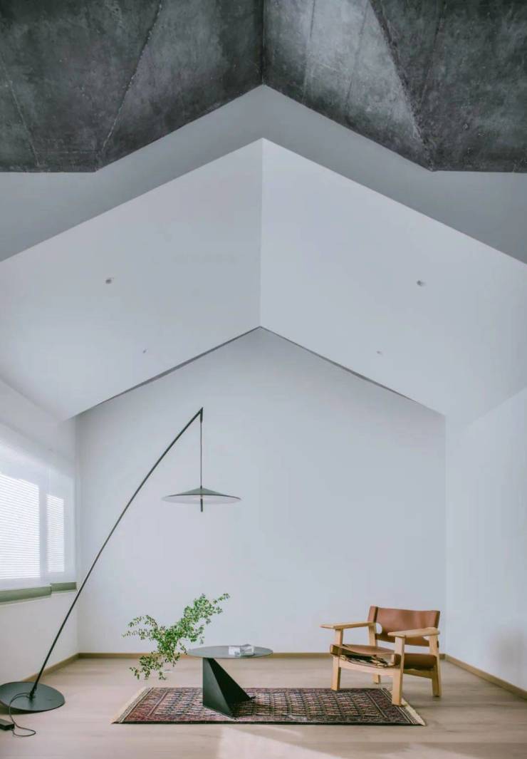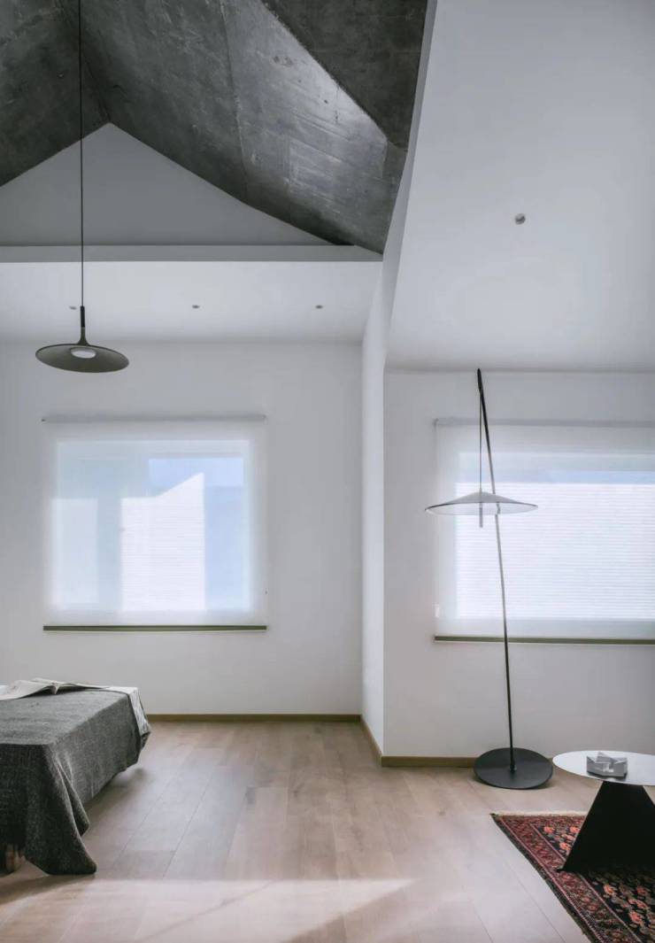 在二楼的卧室空间里,我们暴露建筑原有的混凝土屋顶天花,形成庇护之感。配合南向采光,营造出舒适的卧榻感受。