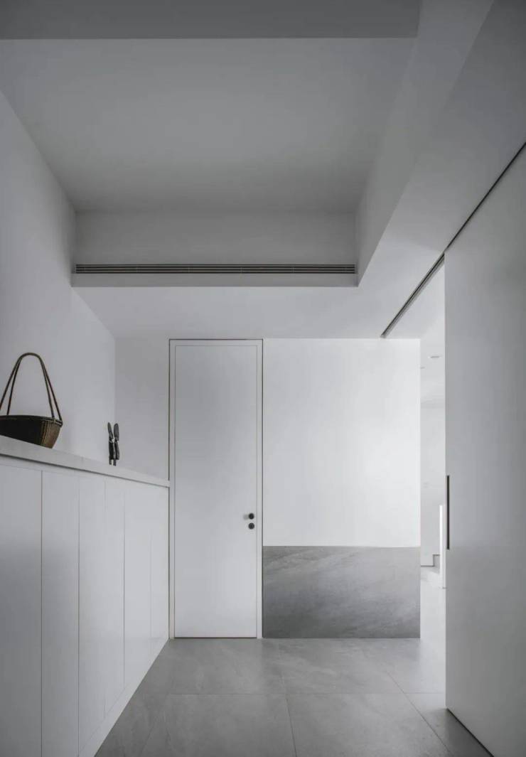 灰色面砖和白墙的搭配营造出轻松的空间氛围,大量的储物空间和墙面融为一体,形成简单而极致的高雅美感。