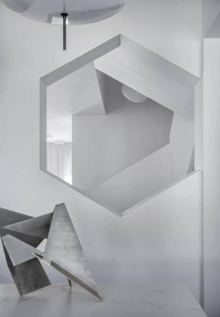 通过巨大的推拉门,六角形洞窗营造出递进的中式园林曲径,使得人们在南北的厨房或起居室中可以观看到更深的视野,与窗外的景观紧密联系,从而营造出隔而不断的流动空间品质。