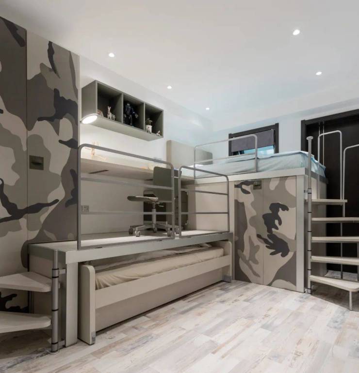 中性干练的X , ^ U X l z线条及1 Q 3 1 ? , T用色,迷彩色调的家具定制使整体空间硬朗、成熟,很好的做到过渡期儿童房使用。