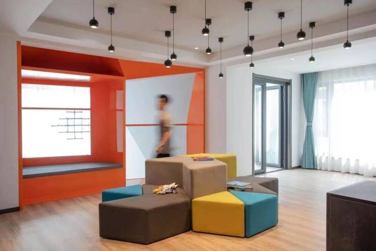 二层设计师有爱地设计了一个儿童天地,移动式色块沙发、橘色阅读飘窗,在这里小朋友有足够的空间“调皮捣蛋”、快乐玩耍了。