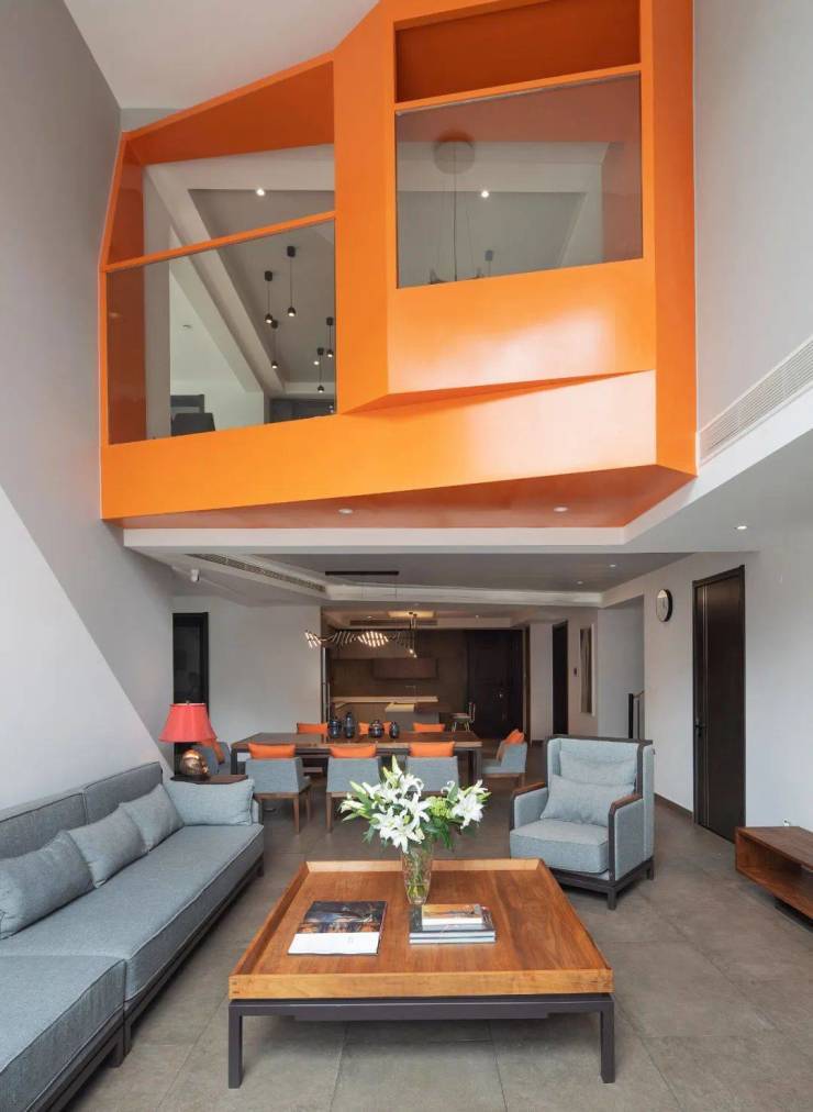 引人注目的是挑空区,加入时尚感很强的二层开放式休闲区设计,给宁静温暖的会客区添加一抹时尚感十足的活力色彩。