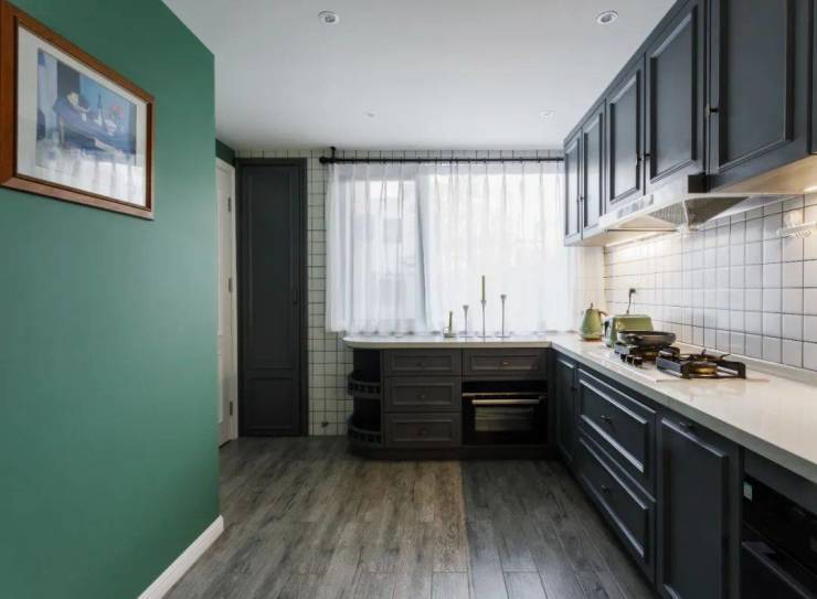 推开餐厅的白色U ; 1门,门. : X后是功能完善的中厨房。在充分考虑厨房工作动线和窗口位置后,设计师整体规划了L型的橱柜。