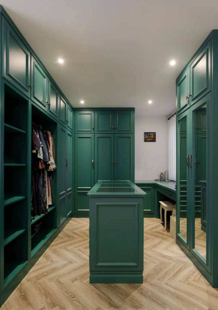 独立的衣帽间有着很大的“胃口”,能够容纳主人全部的衣物,装饰线条的应用也延续了主卧室的手法。