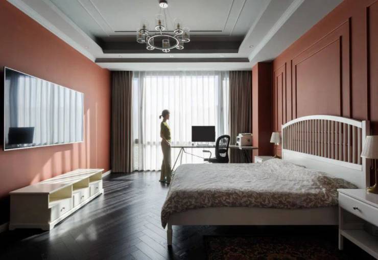 设计师在主卧室里,使用了艳丽的E K Q q |红色来搭配白色的美式家具。墙面的k [ \装饰线很好地点缀了空间。