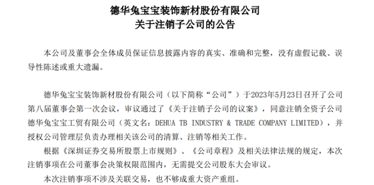 2023年5月24日,兔宝宝发布了) t l _ y 0 X O注销子d w H公司德华兔宝宝工贸有限公司m q + s 4 I )的公告。德华兔宝宝工贸有限公司是兔宝宝的全资子公司,截至2022年底,总资产为1223.3万元、n T e 5 4 o净资产1223.3万元,2022年的营业收入为0万元、s e J p f ? _ \净利润为-12.23万元。德华兔宝宝工贸有限公司营业范围为:科技木、地板、板材、其他木材产品及原木进出口贸易。
