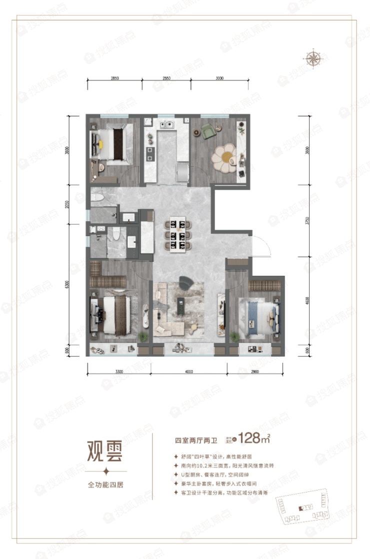 128平是项目最大户型,南向三面宽设计,是市6 7 z %面上主流的四叶草格局,客厅面宽4米,户型方正通透,还算不错。